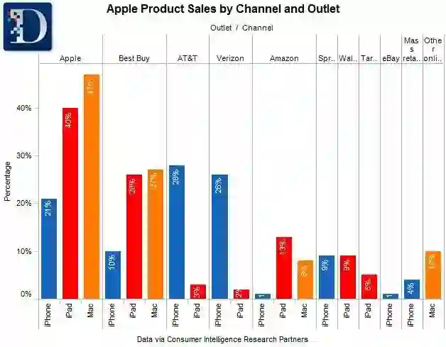 再看看苹果的各种设备的销售,是流向哪些渠道的: