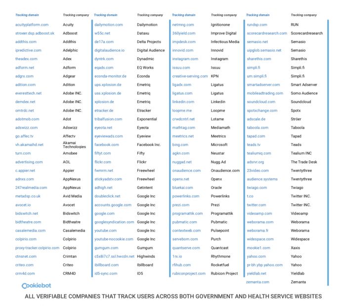 Cookiebot对爱尔兰卫生服务网站的15个页面进行了扫描,发现其中近四分之三页面都含有广告追踪工具;而就法国政府有关流产服务的一个页面而言,有21家不同的公司正在对这个页面进行监控。一个有关产假的德国网页遭到了63个追踪工具的监控,而在提供艾滋病病毒症状、精神分裂症和酒精中毒相关信息的卫生服务网页上则发现了谷歌DoubleClick追踪工具。