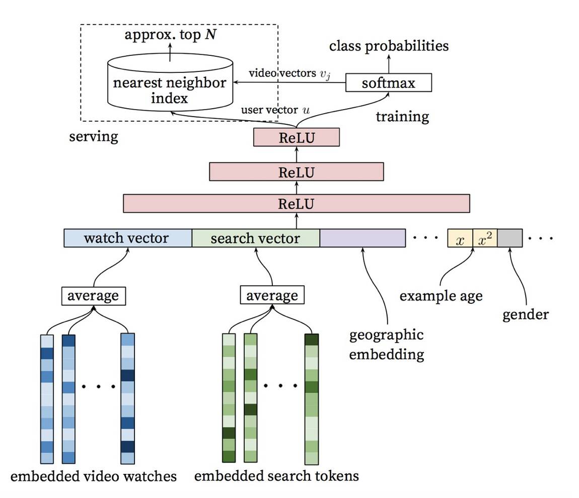 推荐任务就像是一个极端的多类别分类问题,预测问题变成了一个在给定的时间 t 下,基于用户(U)和语境(C),对语料库(V)中数百万的视频类别(i)中的一个特定视频(wt)进行精准分类的问题。