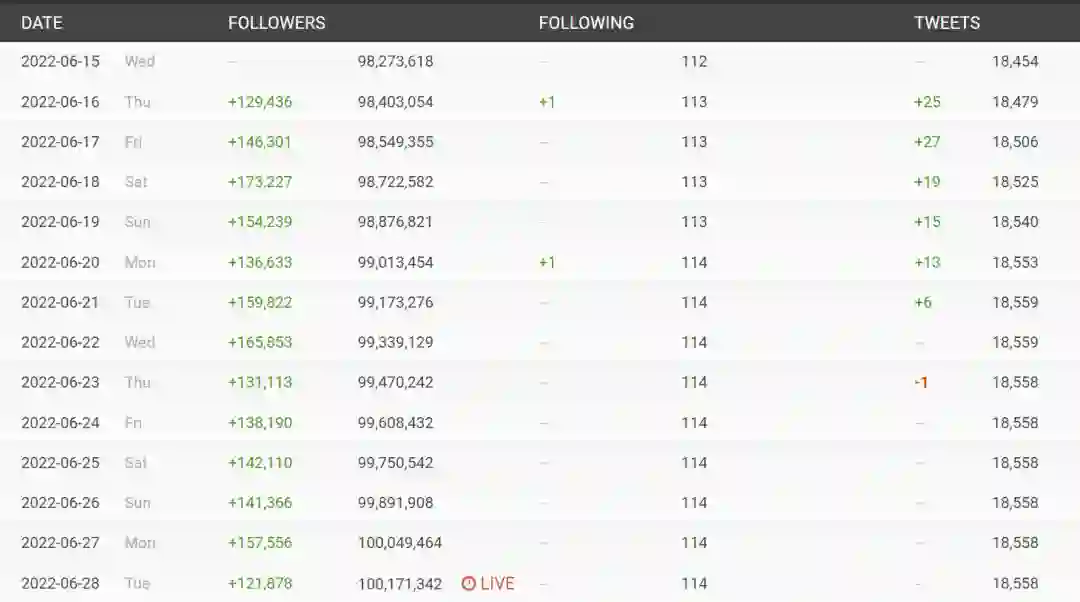 据推流数据监测站Social Blade显示,马斯克在推特上「跨过」1亿粉丝大关的时间,其实是26日到27日之间。最近两周,每日涨粉的数量在15万左右,总体趋势比较平稳。