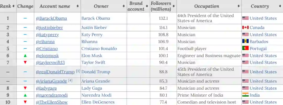 在推特粉丝Top10榜单上,目前排在马斯克前面的有:美国前总统奥巴马、加拿大小鲜肉贾斯丁·比伯、「水果姐」Katy Perry、著名音乐人蕾哈娜、足球巨星C罗。