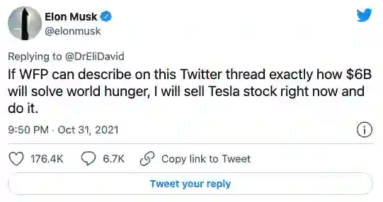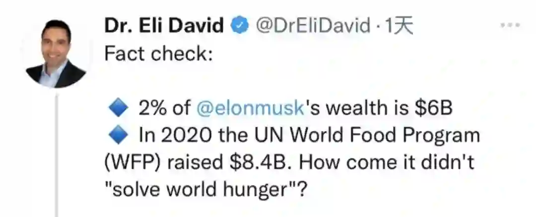 比如前一段时间,联合国世界粮食计划署(WFP)主任找上马斯克,直接开口就要60亿美元,说是能解决全球贫困人口的吃饭问题。