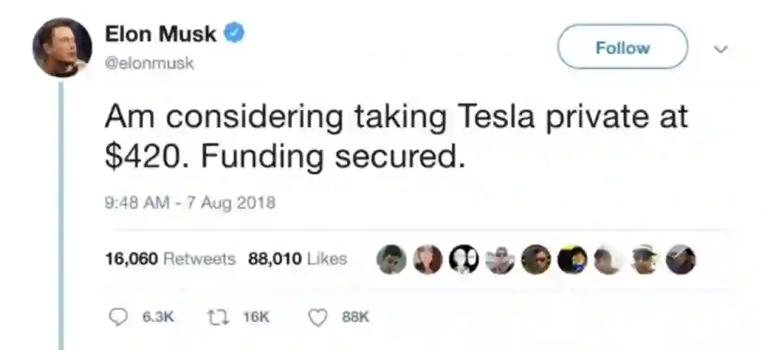 比如2018年这条声称要「私有化特斯拉,资金已经搞定」的推文,最终被证实是为了博小女友Grimes开心一笑而已,就算被美国证监会找上、罚点款,也是心甘情愿了。