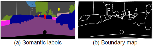 文章指出,示例图(instance map)所提供的最重要的信息其实是物体的边缘。所以本文首先计算出示例边缘图(instance boundary map),如图所示: