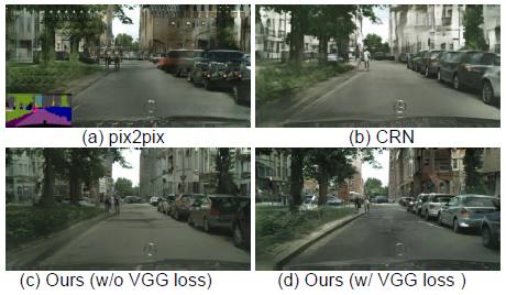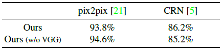 实验中设置 λ=10,K=10,用 3 维向量对示例特征进行编码,采样 LSGANs 用于稳定训练。实验比较了不同的图像合成算法,包括 pix2pix 和 CRN,还比较了加入感知损失(w/o VGG)的结果,其中 F(i) 表示 VGG 网络的第 i 层。