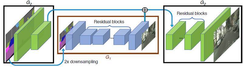这里一个基本的想法是将生成器拆分成两个子网络 G={G1,G2}:全局生成器网络 G1 和局部增强网络 G2,前者输入和输出的分辨率保持一致(如 1024 x 512),后者输出尺寸(2048 x 1024)是输入尺寸(1024 x 512)的 4 倍(长宽各两倍)。