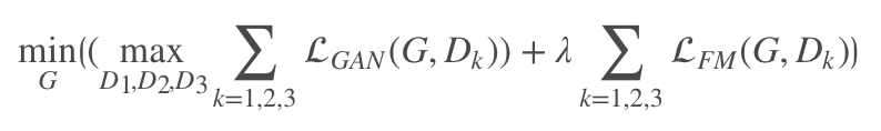 其中表示判别器 Dk 提取的第 i 层特征,T 为总的层数,Ni 为该层总元素的个数。于是,总的目标函数如下: