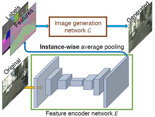 考虑到一个理想的图像合成算法应该能够从同一个语义标签图产生出多种逼真的图像,而现有的方法无法让用户直观地控制产生什么样的图像,并且不允许 object-level 的控制,于是本文提出将额外的低维特征也输入到生成器网络中。