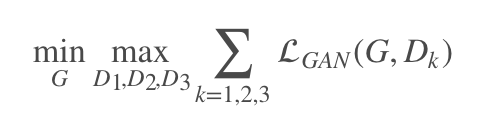 这里用 3 个判别器 {D1,D2,D3} 来处理不同尺度的图像,它们具有相同的网络结构: