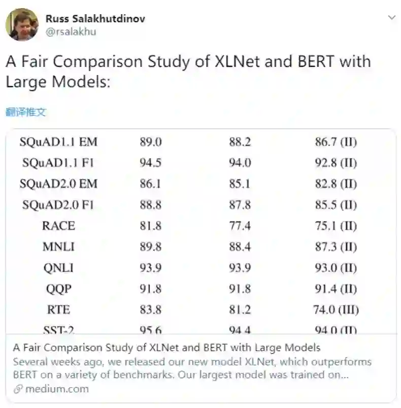 作为 XLNet 工作的导师,卡耐基梅隆大学(CMU)教授 Ruslan Salakhutdinov 也在社交网络上为自己弟子的研究站台。