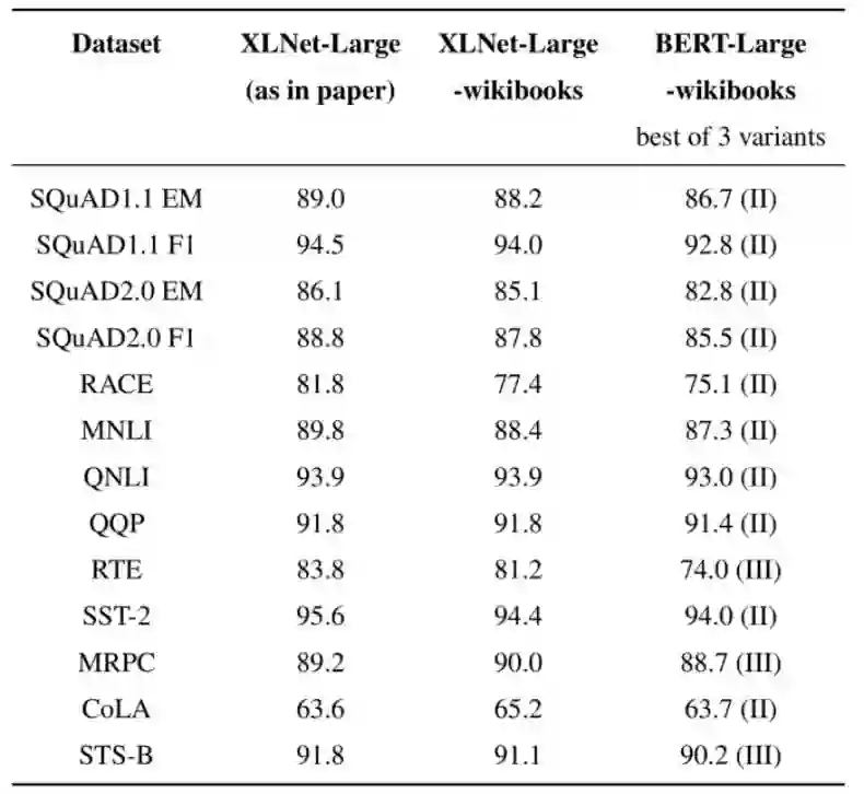XLNet 的作者认为,以上的设置可能给 BERT 带来一些优势,因为单个任务的最好表现结果可能出自不同的 BERT 变体。此外如下图所示的 XLNet-Large(as in paper),它采用了论文中训练结果,即使用更多训练数据和更大的批大小。
