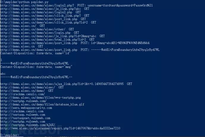 执行模块获取数据后反馈给调度,调度根据去重算法、爬虫深度判断是否继续发送到执行模块。探测模块其实就是用字典去探测是否存在特定目录、文件,执行结束后发送给调度深入挖掘。测试了爬取http://demo.aisec.cn/demo/,结果只能说还算可以,还有很大的改进空间。