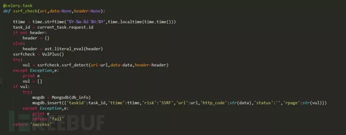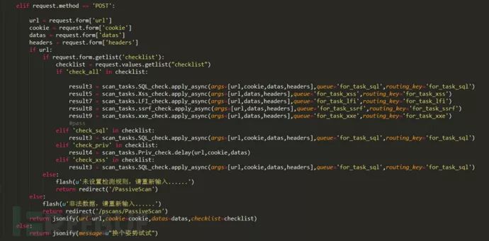 Celery队列调用特定的检测函数(xxe、端口扫描等等),实现检测。此处有一个tips,在使用流量时,有部分字段是不能带入扫描的,否则检测可能失效,比如content-length。此处只举一个例子,检测方法仁者见仁智者见智。但不管主动、被动、端口、插件扫描调度方法是一样的。