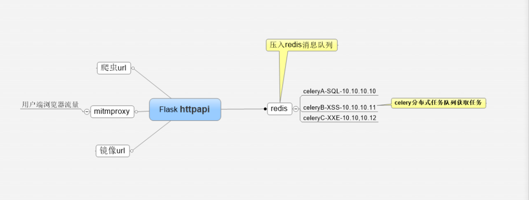 曾经遇到过这样的情况,每天大量检测任务,纯手工又慢又累,而且容易遗漏。像XSS,xxe等常规漏洞,可以把检测方法脚本化,是知识的积累的积累过程。把重复的工作做简单,把简单的事情做好是必须具备的能力。做测试的同学可能有比较深刻感触。因此,被动扫描是刚需。设计原理大同小异,选用mitmproxy作为代理,截取流量,去重后发送到后端任务队列。分享下扫描器设计思路,希望能给需要的朋友带来灵感。扫描器采用纯python实现,前端flask展现、mitmproxy代理、redis消息队列、celery任务队列、mongodb存储。大致架构如下: