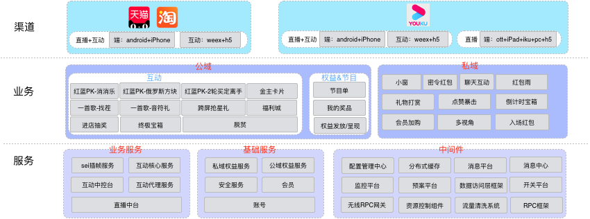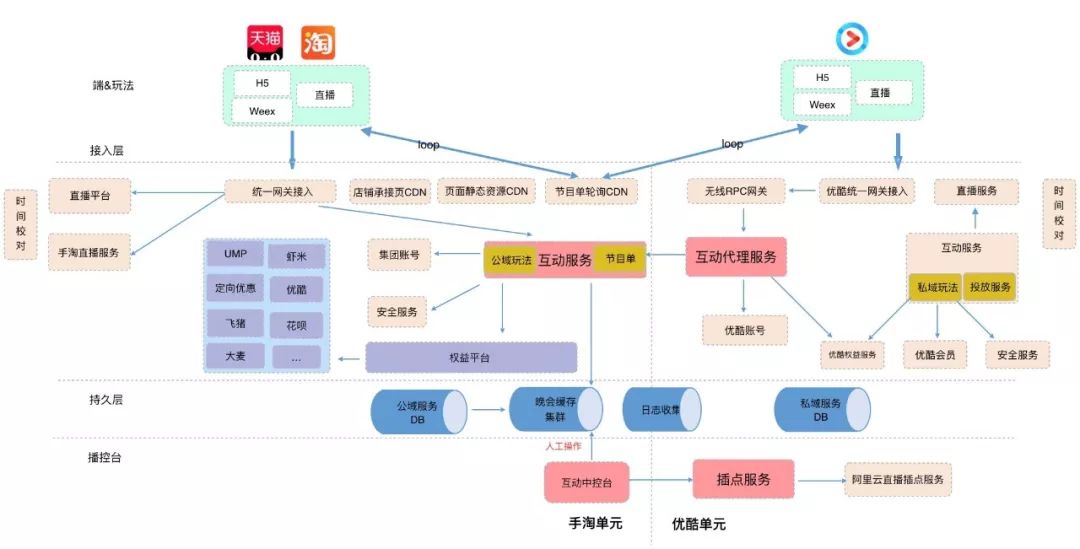 基于以上几个需求,猫晚今年的解法是第一次完全一套代码,运行到手淘、天猫和优酷,在优酷侧部署的代理服务只承载转发和适配不做其他任何业务、核心服务部署到集团机房承载所有的互动玩法和权益发放,技术架构图如下: