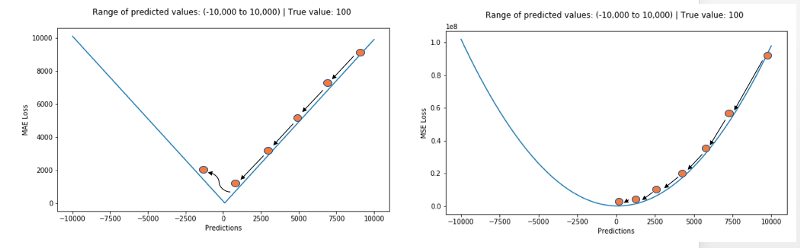 使用MAE损失(特别是对于神经网络)的一个大问题是它的梯度始终是相同的,这意味着即使对于小的损失值,其梯度也是大的。这对模型的学习可不好。为了解决这个问题,我们可以使用随着接近最小值而减小的动态学习率。MSE在这种情况下的表现很好,即使采用固定的学习率也会收敛。MSE损失的梯度在损失值较高时会比较大,随着损失接近0时而下降,从而使其在训练结束时更加精确(参见下图)。