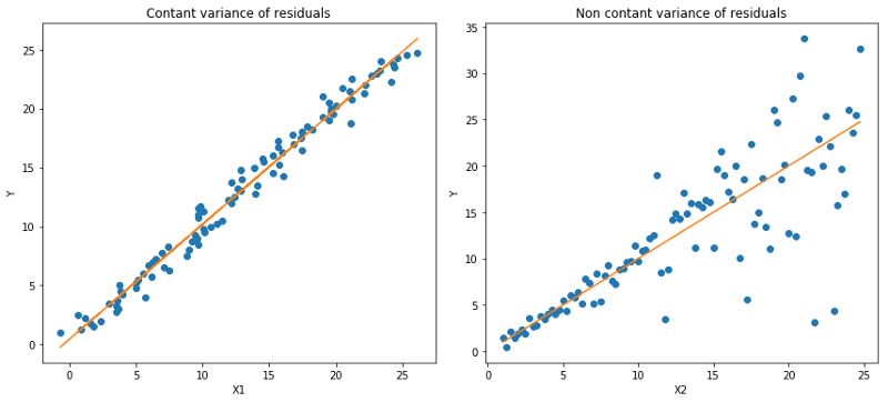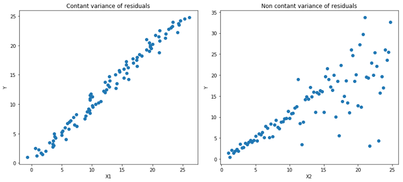 左:线性关系b/w X1和Y,残差的方差恒定。右:线性关系b/w X2和Y,但Y的方差随着X2增加而变大(异方差)。