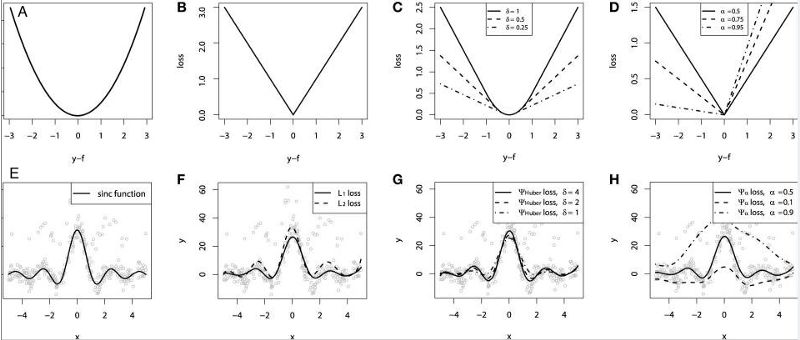 连续损失函数:(A)MSE损失函数; (B)MAE损失函数; (C)Huber损失函数; (D)Quantile损失函数。用有噪声的sinc(x)数据来拟合平滑GBM的示例:(E)原始sinc(x)函数; (F)以MSE和MAE为损失拟合的平滑GBM; (G)以Huber Loss拟合的平滑GBM, = {4,2,1}; (H)以Quantile Loss拟合的平滑GBM。