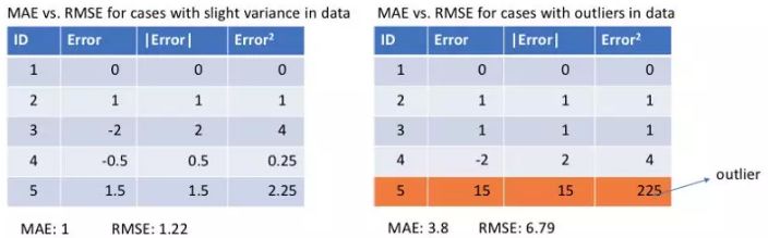 让我们来看看两个例子的MAE值和RMSE值(RMSE,Root Mean Square Error,均方根误差,它只是MSE的平方根,使其与MAE的数值范围相同)。在第一个例子中,预测值接近真实值,观测值之间误差的方差较小。第二个例子中,有一个异常观测值,误差很高。