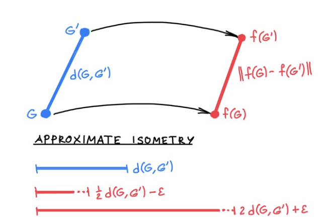 我们可以用一种度量指标 d 来量化「近似同构」的概念,当两图不相似时 d 的值较大,而当两图很相似时 d 的值较小。「图编辑距离」或「Gromov-Hausdorff」距离是两种可能的 d 的示 例。需要注意的是,该度量标准可以被定义为:d(G,G′)=0 当且仅当 G~G′,即说明两个同构图难以被区分。保距嵌入(isometric embedding)问题: