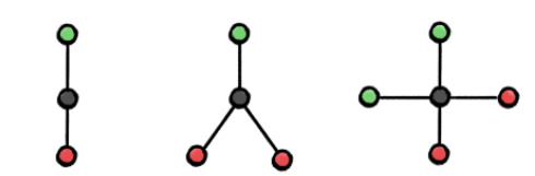 图 3:通过「取最大值」操作无法区分左图、中图、右图,通过「取均值」聚合函数可以区分左图和中图、通过「取最大值」和「取均值」操作均无法区分左图和右图。这是因为通过这些方法从黑色节点的邻居中聚合而来的特征将会是相同的。