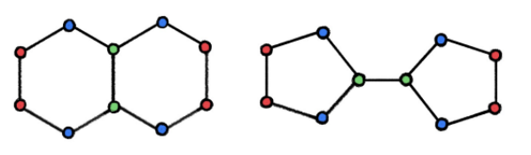 WL 测试是建立在迭代式的图重着色(图论中的「着色」指的是一种离散的节点标签)基础上的,在初始状态下,每个节点的颜色均不相同。在每一步迭代中,算法会聚合节点及其邻居节点的颜色,并将它们表征为多重集,然后将聚合得到的颜色多重集通过 Hash 函数映射到某种唯一的新颜色上。当达到稳定的着色状态(各节点着色状态不再变化)后,算法终止。当算法终止后,若两图的着色情况不同,则我们认为它们「非同构」。如果两图着色情况相同,它们可能(但并不一定)是同构的。换句话说,WL 测试是图同构的必要非充分条件。有一些非同构的图在接受 WL 测试后得到的着色情况也是相同的,而在这种情况下 WL 测试就失效了,因此我们只能认为它们「可能同构」。下图展示了其中的一种可能性: