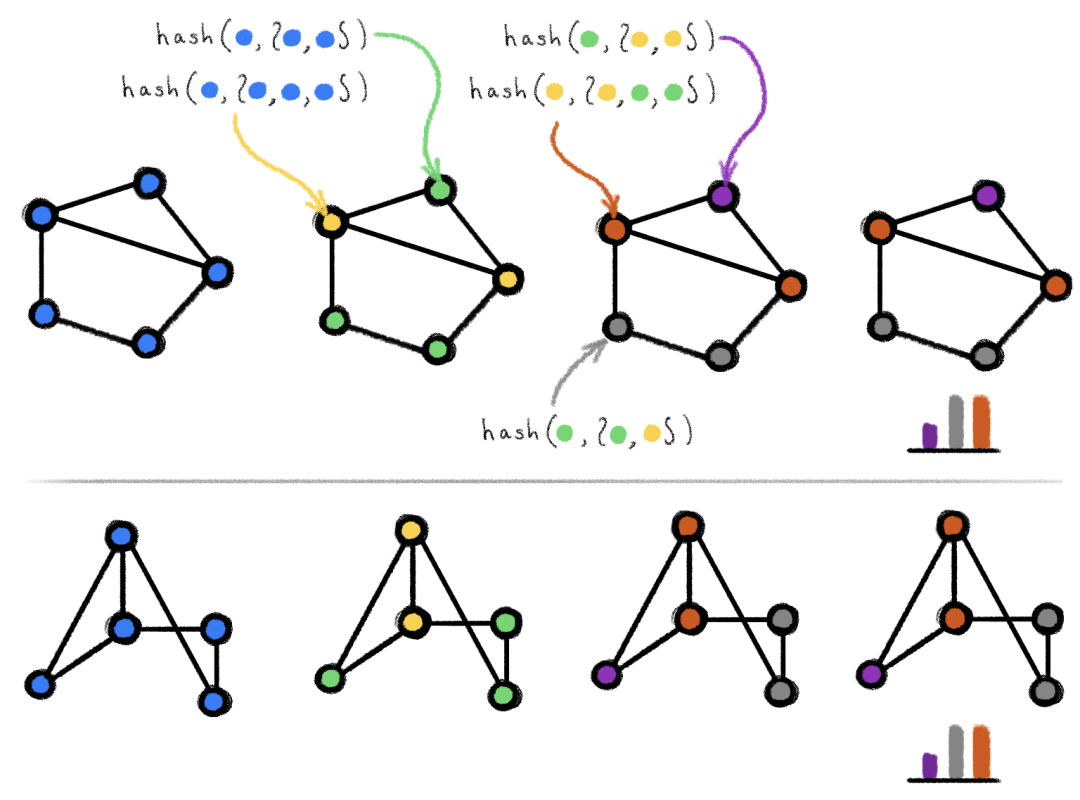 图 1:在两个同构图上执行 WL 测试的示例。包含弧线的 hash 圆括号代表多重集。在着色情况不再变化后算法会终止,并给出输出结果(颜色直方图)。若将两图输入给该算法得到的输出相同,则说明两图可能同构。