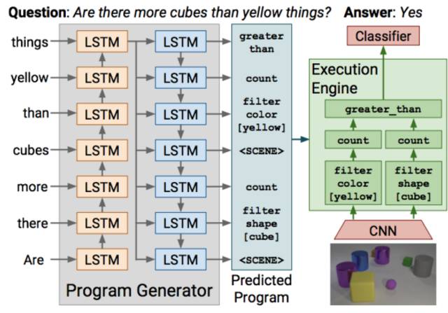简要的说明一下这个模型,首先是一个Program Generator,就是一个Seq-to-Seq的LSTM网络,输入问题,输出预测的小程序,也就是要回答这个问题所需要的逻辑推理。接下来,图像那一边输入CNN提取特征,将小程序和图像特征放到Execution Engine也就是程序执行的地方,执行程序,最后输出到分类器输出答案。