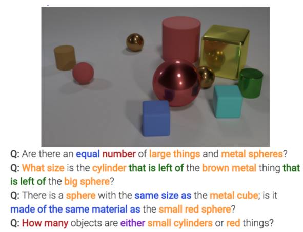 视觉推理在这里主要是限定在VQA(Visual Question Answering)的问题上,也就是让计算机看一副图,然后给出一个问题,让其回答。相比传统的VQA问题,视觉推理问题的要求是要让问题难度提升,必须经过推理才能回答。CLEVER数据集[1]就是这样一个专门针对视觉推理而诞生的数据集。CLEVER数据集是Li Fei-Fei团队做出的成果,不得不说Li Fei-Fei总是特别有远见的通过为大家贡献数据集来引领人工智能的发展。CLEVER数据集是怎样的呢?