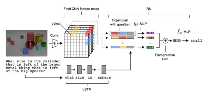 论文最核心的想法就是把CNN提出的feature特征信息当做图像中的物体来看待,然后不同物体两两组合再加上问题的LSTM输出特征,连在一起经过MLP输出一个所谓的关系feature,然后把所有的关系加在一起经过MLP输出结果!所以,这个模型真的超级简单!