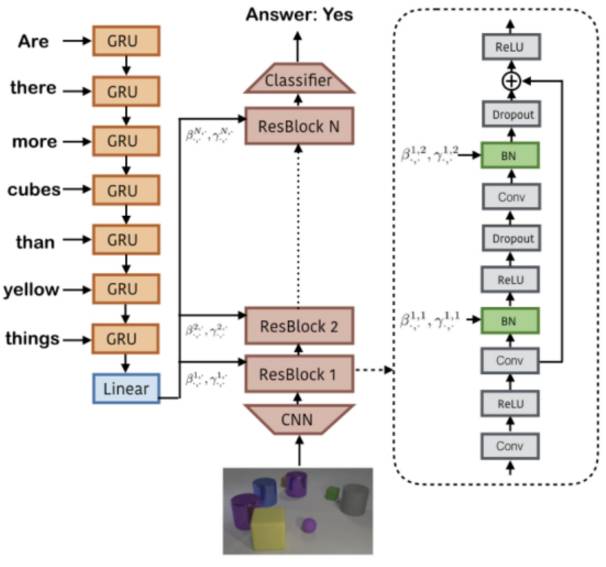 然后是图像输入部分,先用一个使用ImageNet预训练的ResNet提取出14x14的特征信息,然后输入到ResBlock中,每个ResBlock如上图所示包含了2个CBN。接下来就是把ResBlock全部连接起来,使用端到端训练。