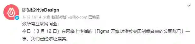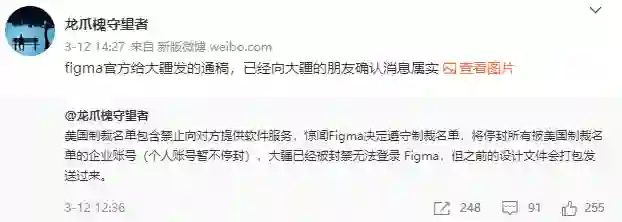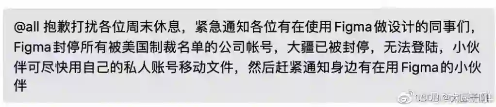 知群 CEO @马力在知群 也发布了相关通知截图:“紧急通知各位有在使用 Figma 做设计的同事们,Figma 封停所有被美国制裁名单的公司账号,大疆已被封停,无法登录,小伙伴可尽快用自己的私人账户移动文件,然后赶紧通知身边有在用 Figma 的小伙伴。”