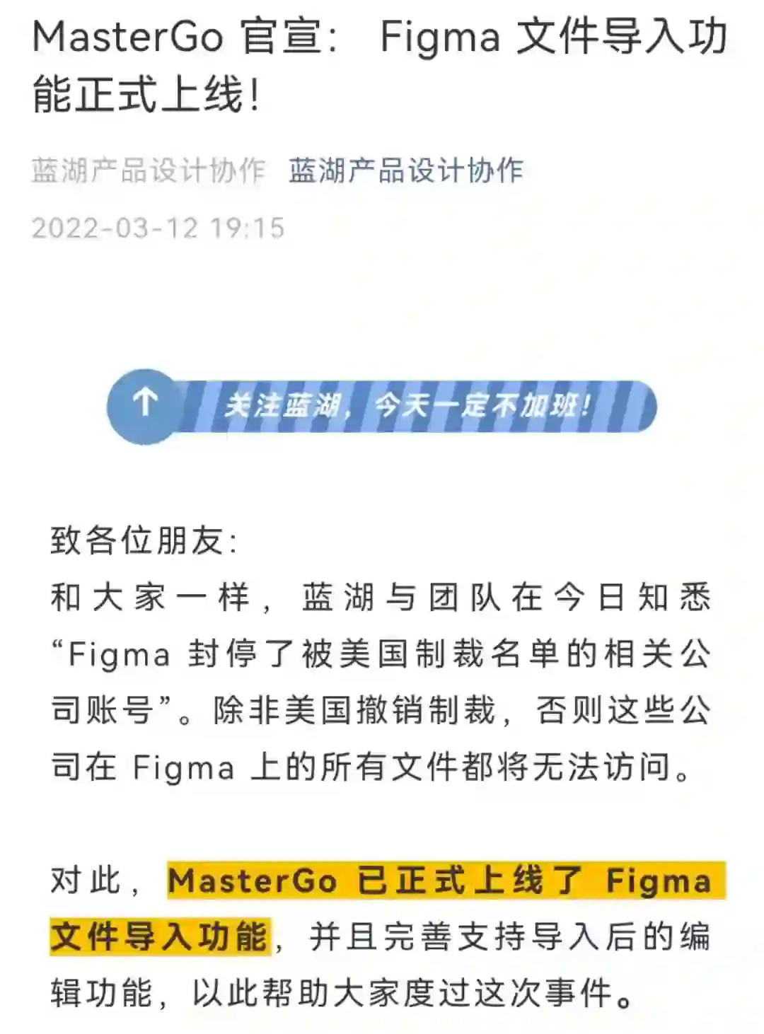 MasterGo:“MasterGo 已正式上线了 Figma 文件导入功能,并且完善支持导入后的编辑功能,以此帮助大家度过这次事件。”