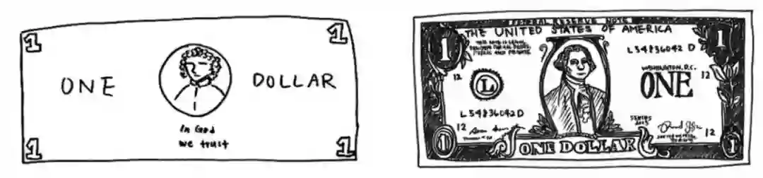 ▲ 当你被要求画一张美元,左边是没有钞票在你面前,右边是面前摆着一张钞票画出来的结果