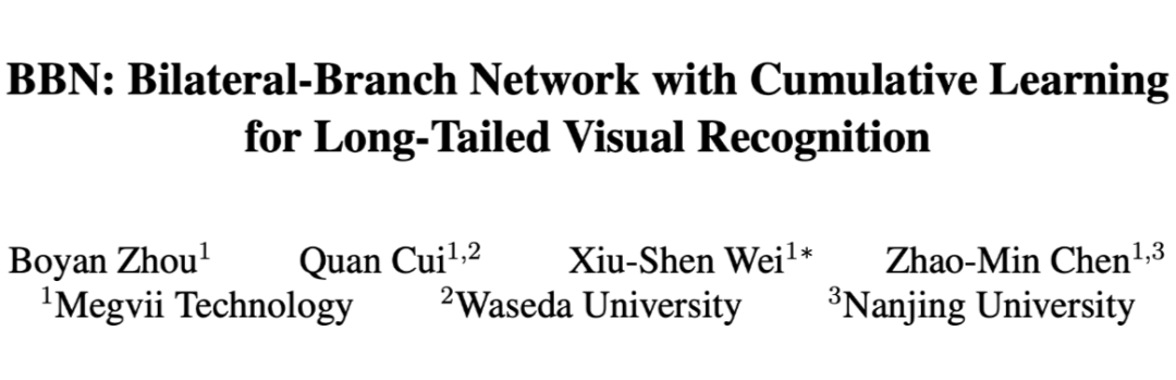 论文名称:BBN: Bilateral-Branch Network with Cumulative Learning for Long-Tailed Visual Recognition论文链接:www.weixiushen.com/publication/cvpr20_BBN.pdf开源代码:https://github.com/Megvii-Nanjing/BBN