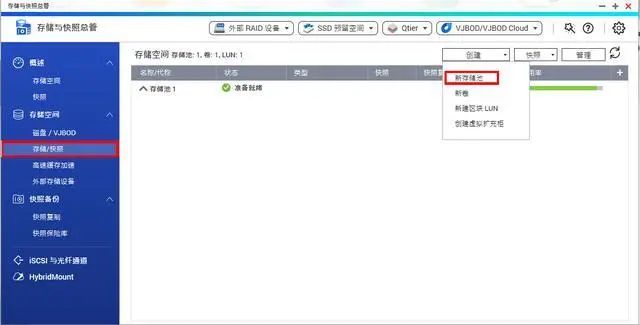 然后点击新页面左边的「存储 / 快照」,在左上角的「创建」中选择「新存储池」。这个时候你的页面中是没有存储池的,因为我之前创建过,所以显示存储池 1。
