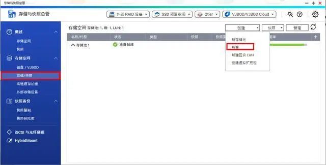 完成存储池的设置后,就要继续在这个存储池(可用空间)的基础上创建「新卷」。