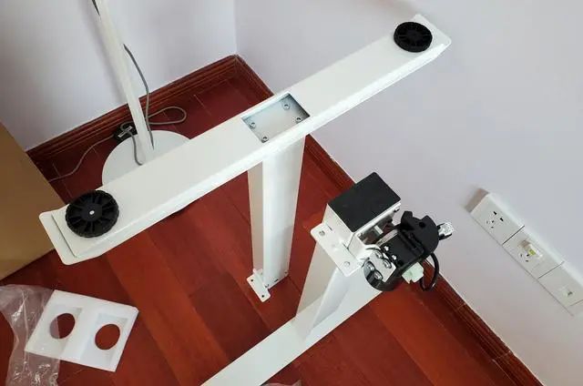 安装第一步,将桌腿组装起来,桌腿分为两个竖直支撑和两个横向支撑,均为金属冷轧钢板,表面白色光滑喷塑。