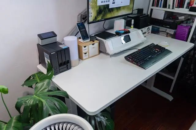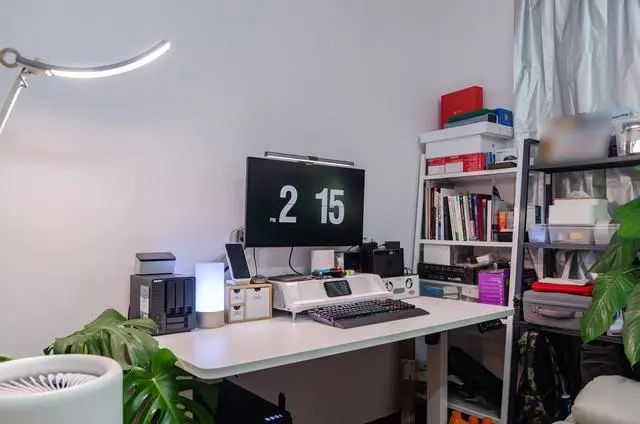 乐歌升降桌、QNAP 的 NAS、机械键盘、网件路由、浦力适除湿机、空气净化器、绿植、墙纸、窗帘等。