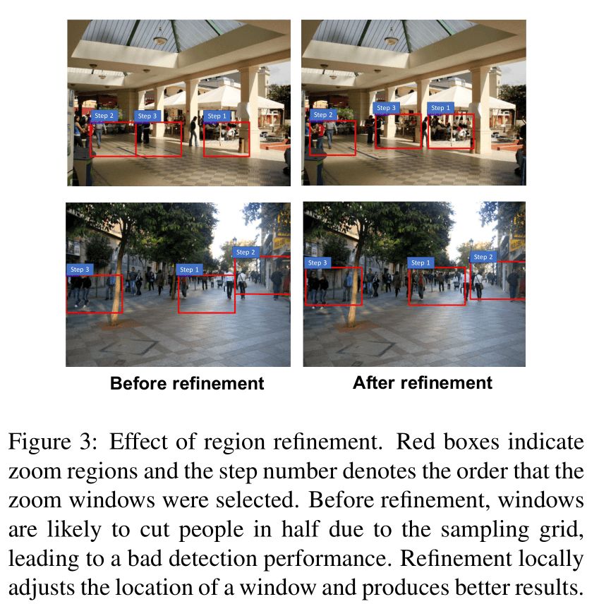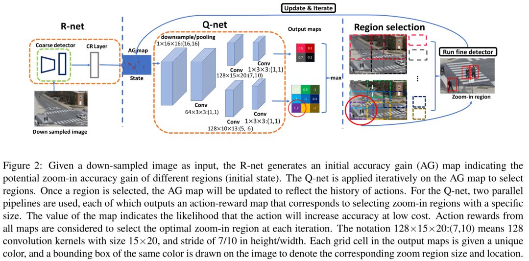 以 Figure 2 为例,输出两种大小的放大动作,分别将将原图划分2x2个和3x3个区域,一共13个动作,每个动作有一个得分,选择得分最高的区域进行放大检测。