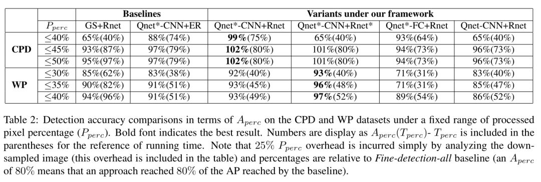 实验的评测标准以 Fine-detection-all 为基准,评测标准如下,其中后两项用于衡量计算耗时: Aperc 带评测检测器 AP 占 Fine-detection-all 结果百分比; Pperc 处理像素百分比; Tperc 检测用时百分比。