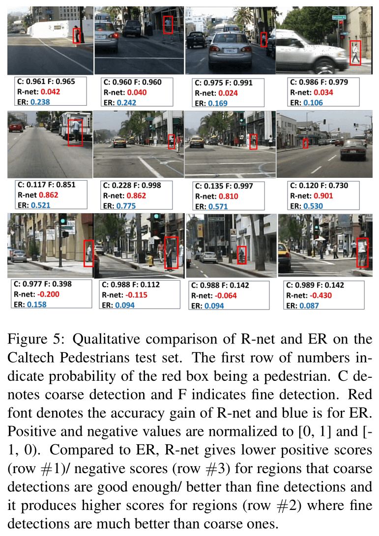 其中 C 和 F 分别表示粗糙和精细检测器预测红框是行人的概率,红色值表示 R-net 预测的 accuracy gain,蓝色的值表示使用交叉熵损失。