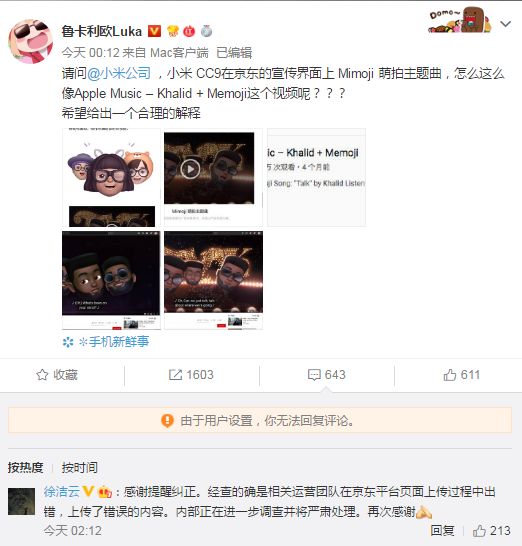 【小米再曝抄袭苹果,回应:上传错误内容】7月5日凌晨,针对有微博博主质疑称小米Mimoji宣传页出现苹果Memoji的广告视频,小米集团公关部总经理徐洁云回应称,“经查的确是相关运营团队在京东平台页面上传过程中出错,上传了错误的内容。内部正在进一步调查并将严肃处理。”