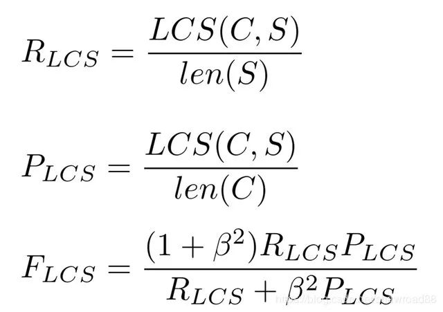 ROUGE-L 中的 L 指最长公共子序列 (longest common subsequence, LCS),ROUGE-L 计算的时候使用了机器译文C和参考译文S的最长公共子序列,计算公式如下:
