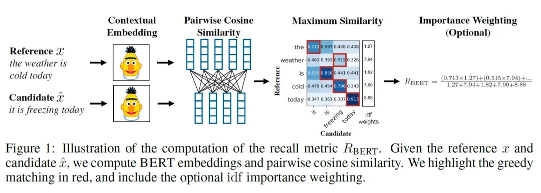 思路是非常简单的:即对两个生成句和参考句(word piece进行tokenize)分别用bert提取特征,然后对2个句子的每一个词分别计算内积,可以得到一个相似性矩阵。基于这个矩阵,我们可以分别对参考句和生成句做一个最大相似性得分的累加然后归一化,得到bertscore的precision,recall和F1: