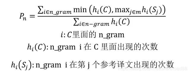 公式的分母是统计在参考译文中 N-gram 的个数,而分子是统计参考译文与机器译文共有的 N-gram 个数。