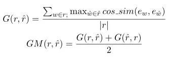如上图所示,对于真实响应的每个词,寻找其在生成响应中相似度最高的词,并将其余弦相似度相加并求平均。同样再对生成响应再做一遍,并取二者的平均值。上面的相似度计算都是基于词向量进行的,可以看出本方法主要关注两句话之间最相似的那些词语,即关键词。