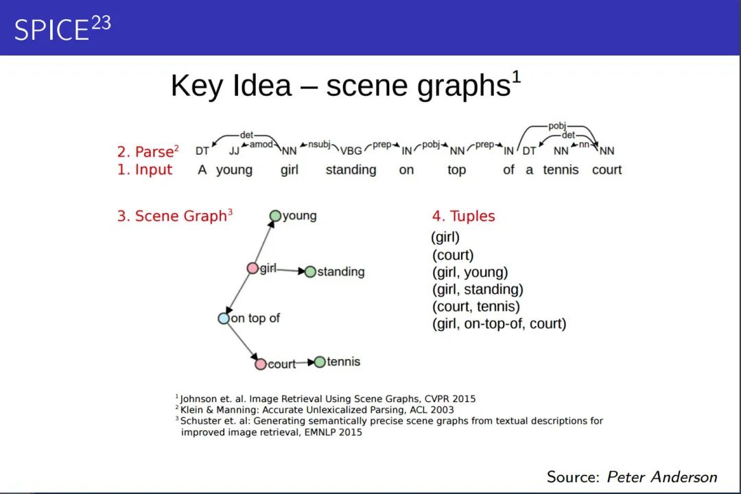 SPICE 使用基于图的语义表示来编码 caption 中的 objects, attributes 和 relationships。它先将待评价 caption 和参考 captions 用 Probabilistic Context-Free Grammar (PCFG) dependency parser parse 成 syntactic dependencies trees,然后用基于规则的方法把 dependency tree 映射成 scene graphs。最后计算待评价的 caption 中 objects, attributes 和 relationships 的 F-score 值。