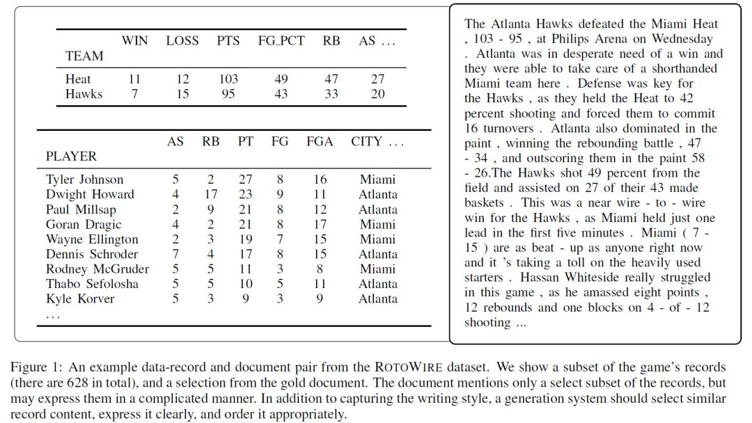 具体到某一个任务而言(这里以ROTOWIRE数据集,篮球比赛报道为例),ROTOWIRE数据以(entity , value , type),例如(MIAMI HEAT,95, POINTS)的形式出现。针对以下参考句: