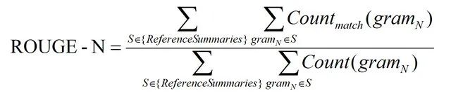 ROUGE-N 主要统计 N-gram 上的召回率,对于 N-gram,可以计算得到 ROUGE-N 分数,计算公式如下: